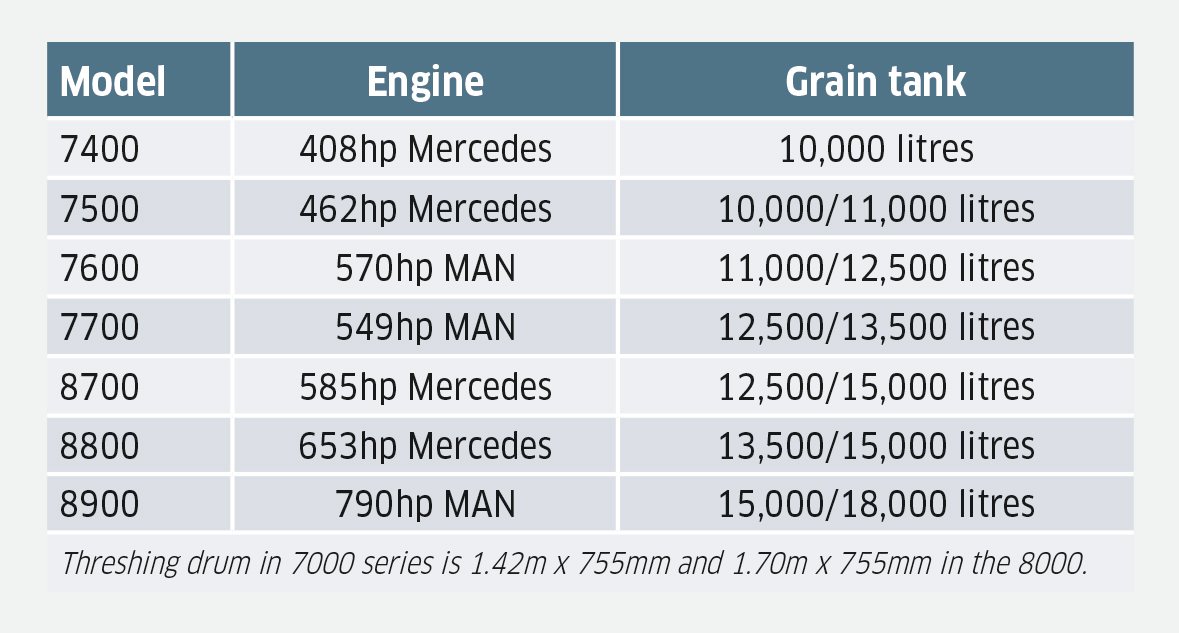 Grain tank capacities have been given a bump with the 8900 having the option of an 18,000 litre bin. There is also the option of a 180l/sec unloading auger which can be slowed to half rate for topping off trailers; 130l/sec is standard. Auger pivot angle has been increased from 101° to 105° to improve visibility.