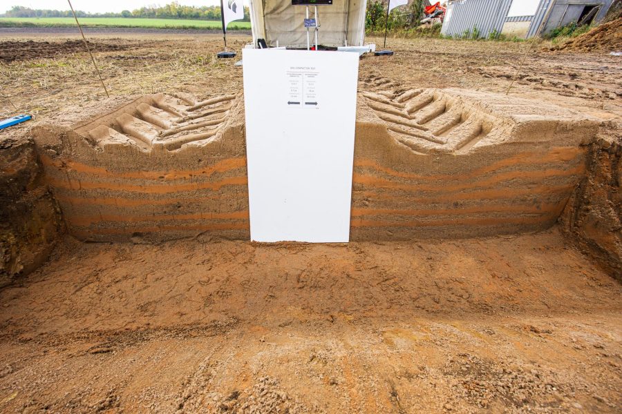 The field specialists laid out a number of plots to demonstrate the benefits of a VF tyre and how setting the correct pressure can dramatically affect the profile. Probably the best visual was the sand pit, where the team had dug the pit, filled it with different coloured layers of sand, then carefully excavated it to show the compaction patterns of the VF and radial.