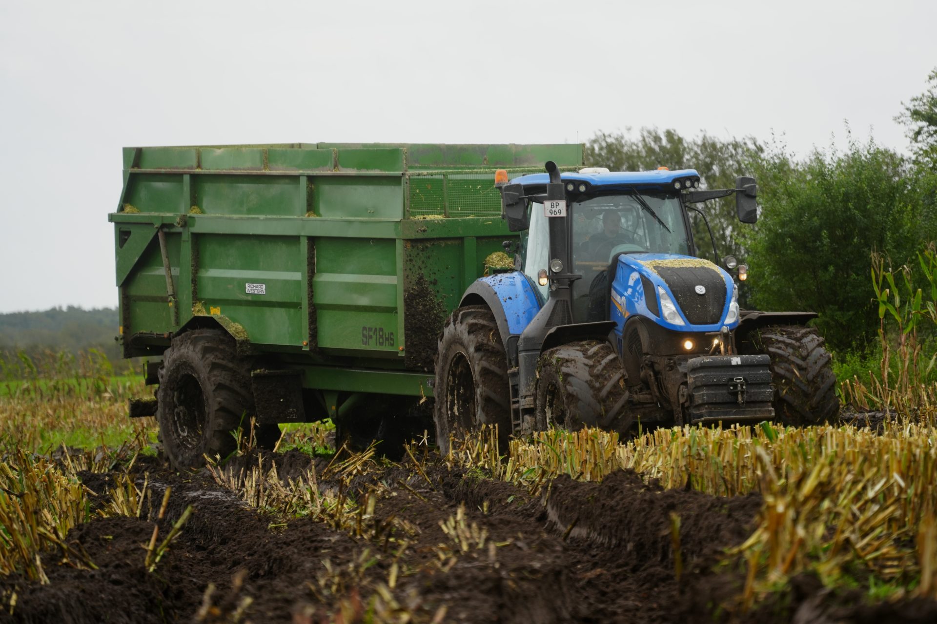 The powered axle and larger tyres on this Richard Western SF18 trailer allowed Danish contractor Gads Maskinstation to crack on in the wet and complete this season’s difficult maize harvest.