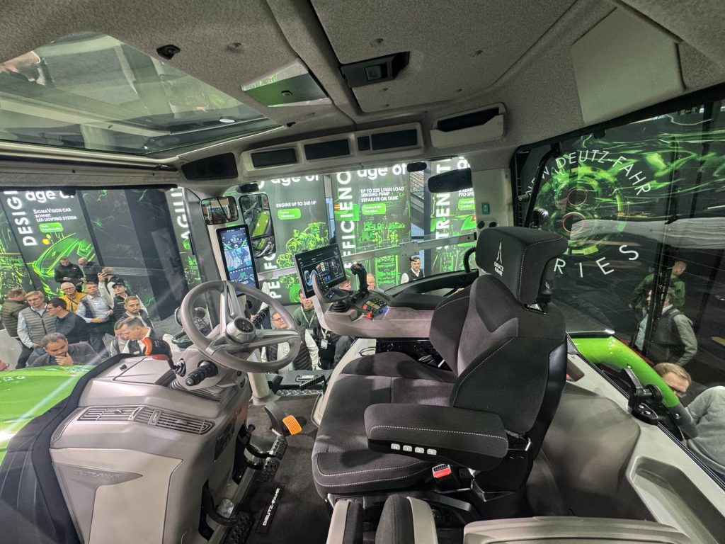 The four post cab is 200mm wider, 200mm longer and offers 30% more volume than before. That helps account for the 11% bigger glass area. There is a new armrest complete with a new IMonitor 5 display (this Topcon sourced screen is also appearing in other Deutz-Fahr models as of now) and 29 configurable buttons. There is also a 15-inch large, colour A-pillar display for the main functions plus camera feeds.