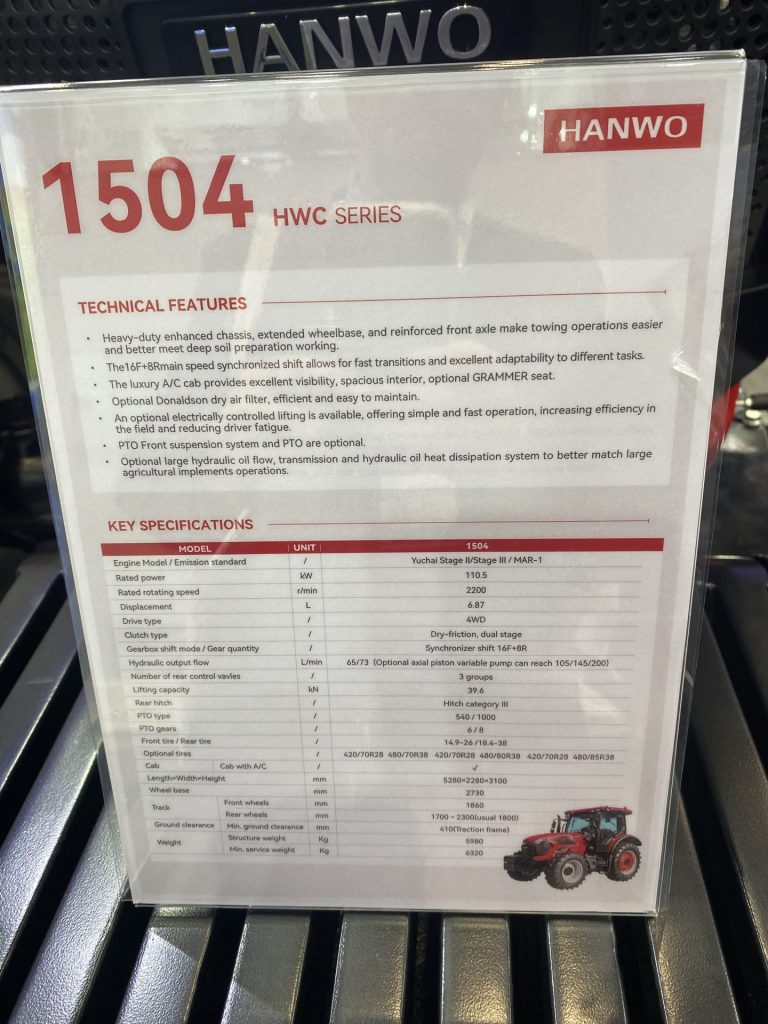 Chinese tractor manufacturer Shandong Hanwo used Agritechnica to gauge visitor interest in the latest versions of the HWC Series from 128hp to 158hp.