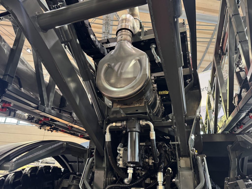 The 310hp Cummins engine sits between the boom carrying linkage. Christoph points out that as well as aiding weight balance, this new location for the engine will also reduce noise in the cab. Hardi has also switched from Poclain to Bosch Rexroth for the hydrostatic drive system. It also plans on developing a high-clearance version which will clear up to 1.65m tall crops.