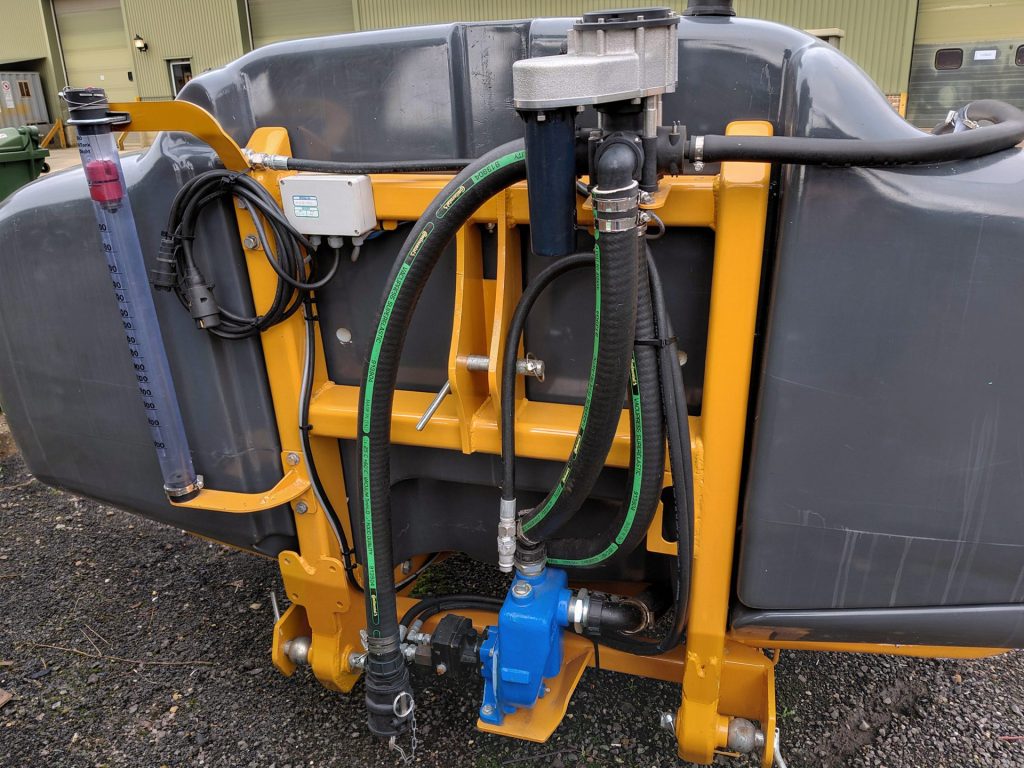 Tanks are corrosion resistant and roto-moulded to a profile that maximises operator visibility. Specification includes a front fill point with filtration screen, high volume centrifugal pump and rear delivery pipe, and electronic transfer with in-cab control. The tank profile incorporates tank wash heads supplied by a separate clean water tank, plus a hand-wash tank.
