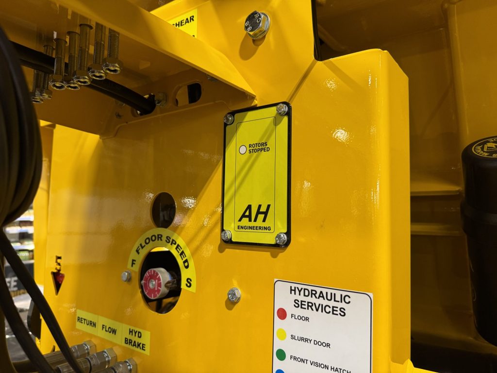 Of wider appeal, is an automatic floor stop function that is triggered when the rotors are stopped, either when the shear bolt snaps or more when the spreader is empty and returning to the stack. Experience with its hire fleet, suggests that operators do occasionally forget to turn off the floor and then start loading, which can lead to predictable consequences. There is an override function on the panel at the front of the spreader which allows the floor to be moved when the rotors are disengaged.