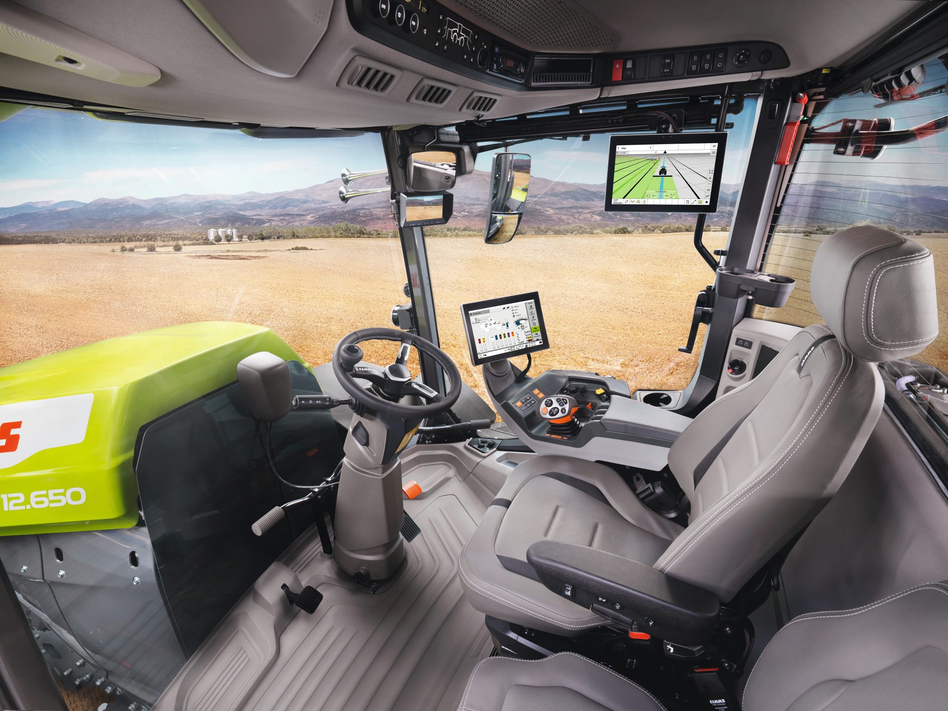 Key functions are operated and monitored via the armrest with CMotion multifunction control lever and Cebis touchscreen terminal. This standard control concept is now available for all Claas tractors from 125hp to 653hp.