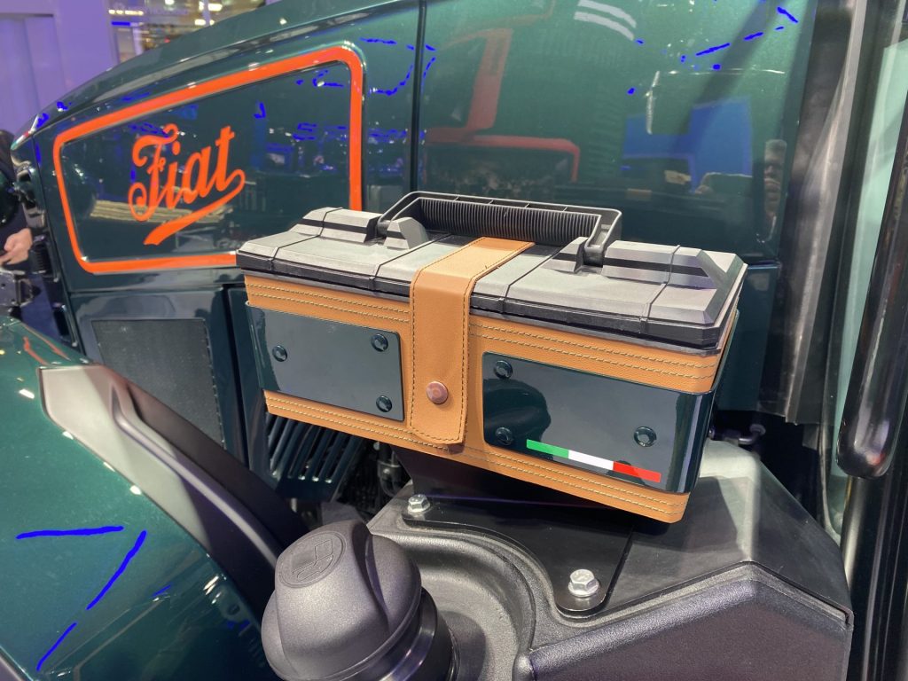 The Fiat graphic on the front grille is a nice touch as is the leather-clad toolbox, seat, and steering wheel.