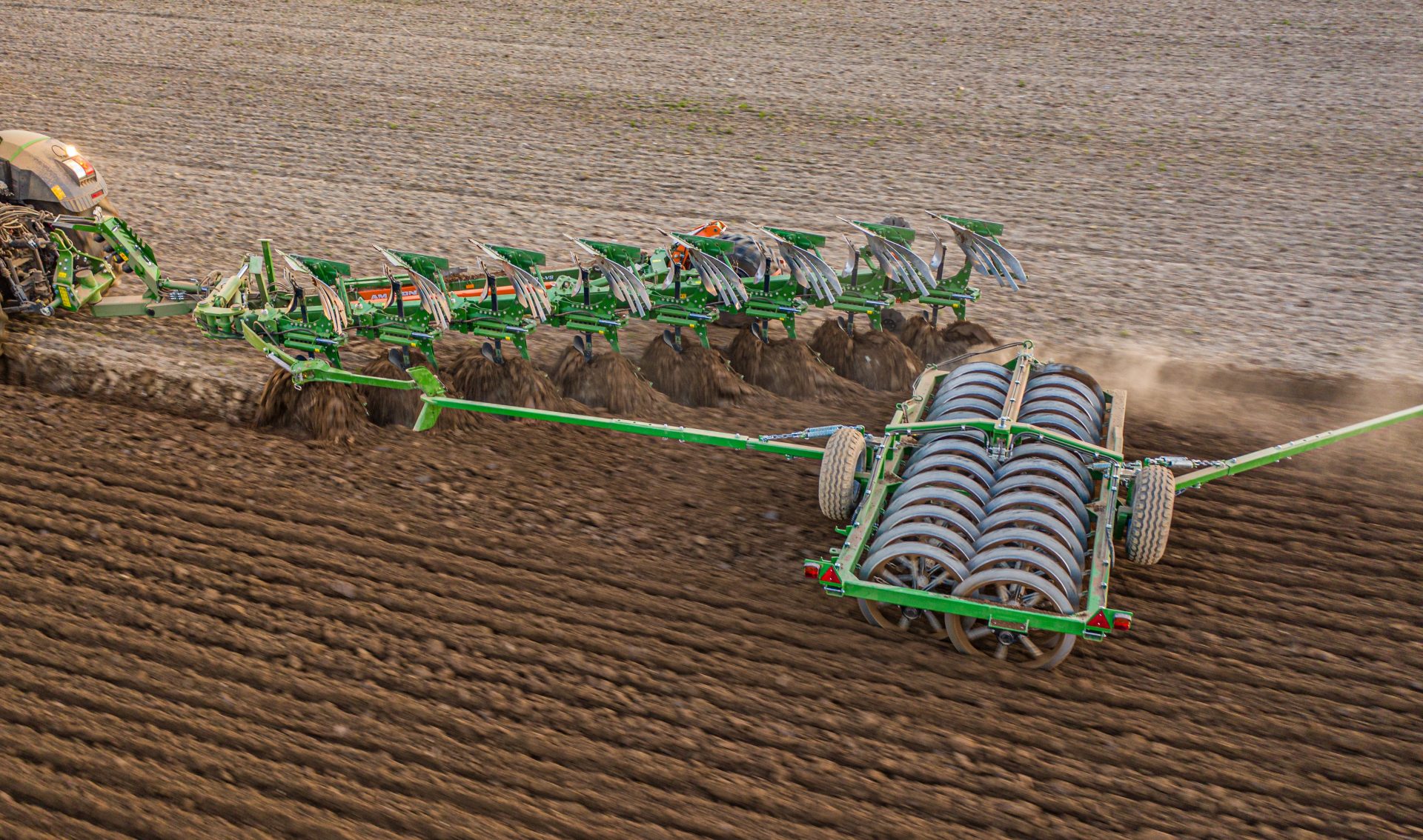 Optional soil engaging tools include various skimmers and trash boards and additional landside protectors can be attached to the shares when working on slopes. An optional sword landside, which protects the edges of the front shin of the mouldboard from wear and cuts a clean furrow wall, is said to be ideal for stony and heavy soils. Disc coulters can be fitted to the last body.