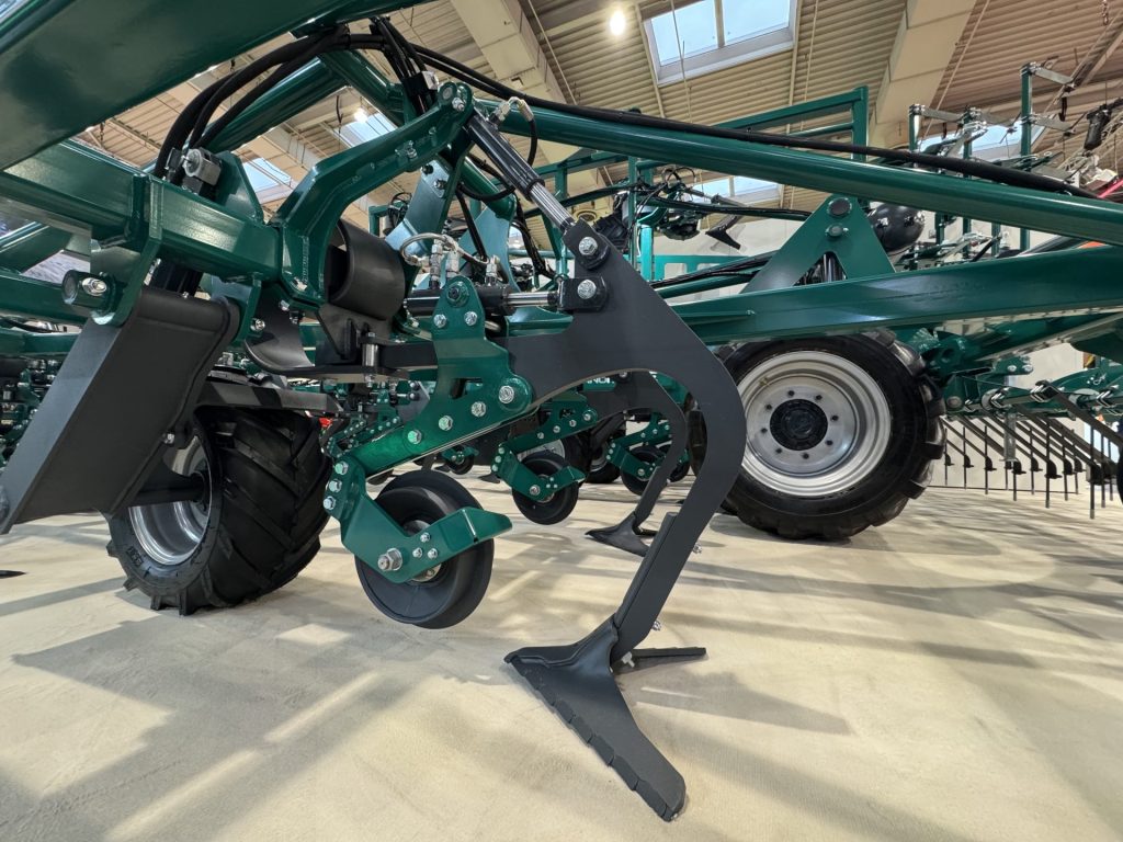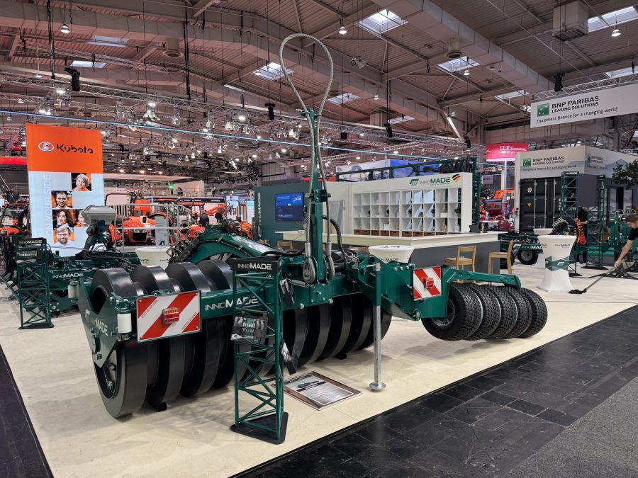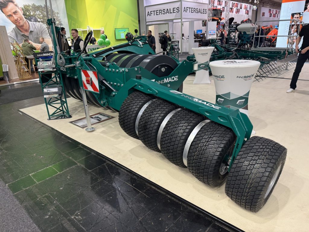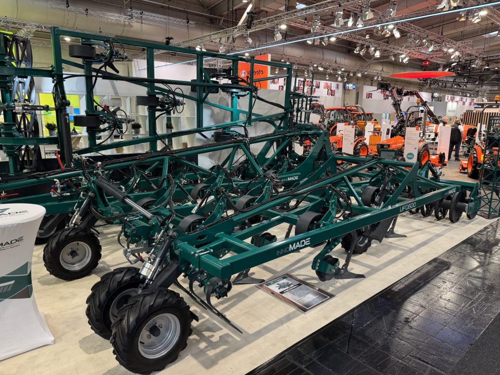Around the corner, InnoMade (formerly called Eidam) was showing the Ultra Flat Grubber, or UFG for short. For now there is just a 6.0 version of the cultivator which is designed for precise, shallow tillage from 2cm down to 11cm. This is partly thanks to the tine layout. Each one has a central cutting disc as part of the gauge roller and then two hydraulic rams connected to the tine so that is remains vertical if there is a change in depth. To trim the cost from €57,000 to €52,000 one of the rams can be swapped for a turnbuckle.