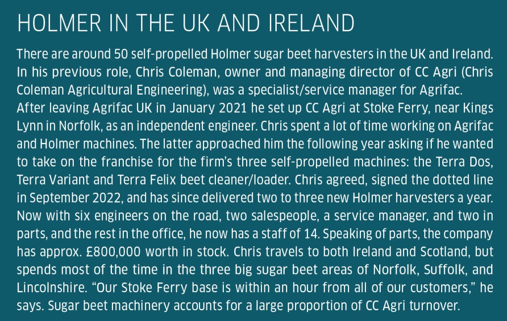 Chris Coleman, owner and managing director of CC Agri, says he has delivered 2-3 new Holmer harvesters a year since taking on the brand in 2022.