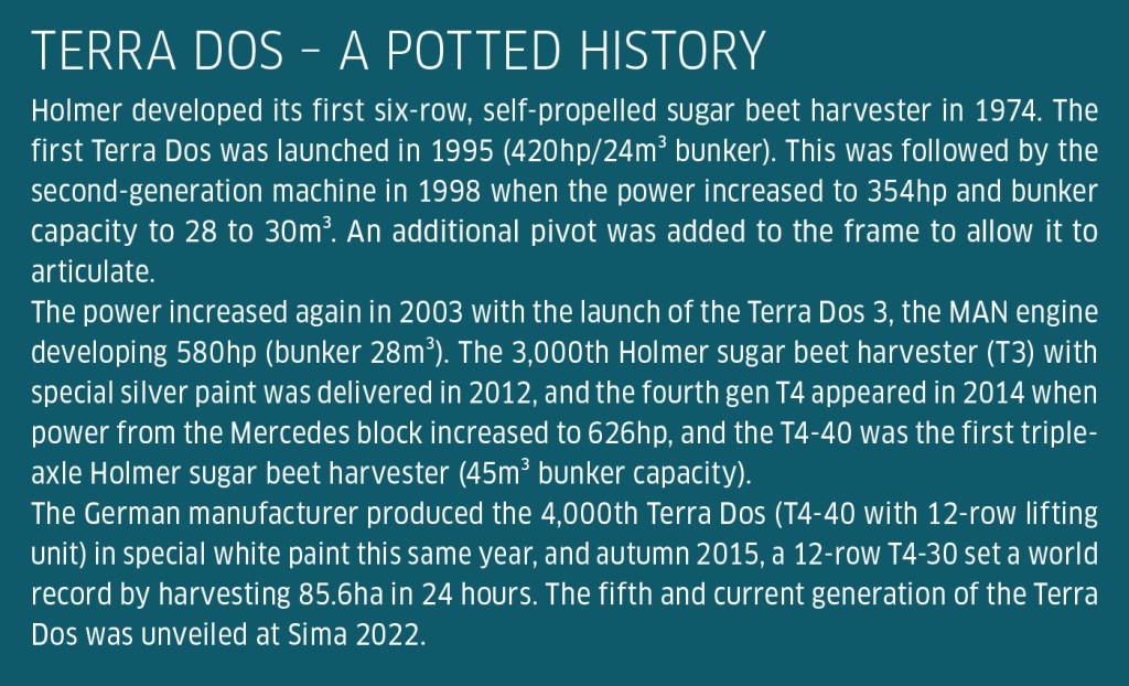 There are two core models in the latest Terra Dos 5 series, the 45m³ bunker triple-axle 5-40 launched at Sima 2022, and the twin-axle 5-30 (30m³/21t). Both drop the ‘T’ from the series name, and the Ivatt’s roughly £660,000-costing harvester, which was delivered at the start of this season, had lifted 390ha in 315 engine hours at the time of our visit.