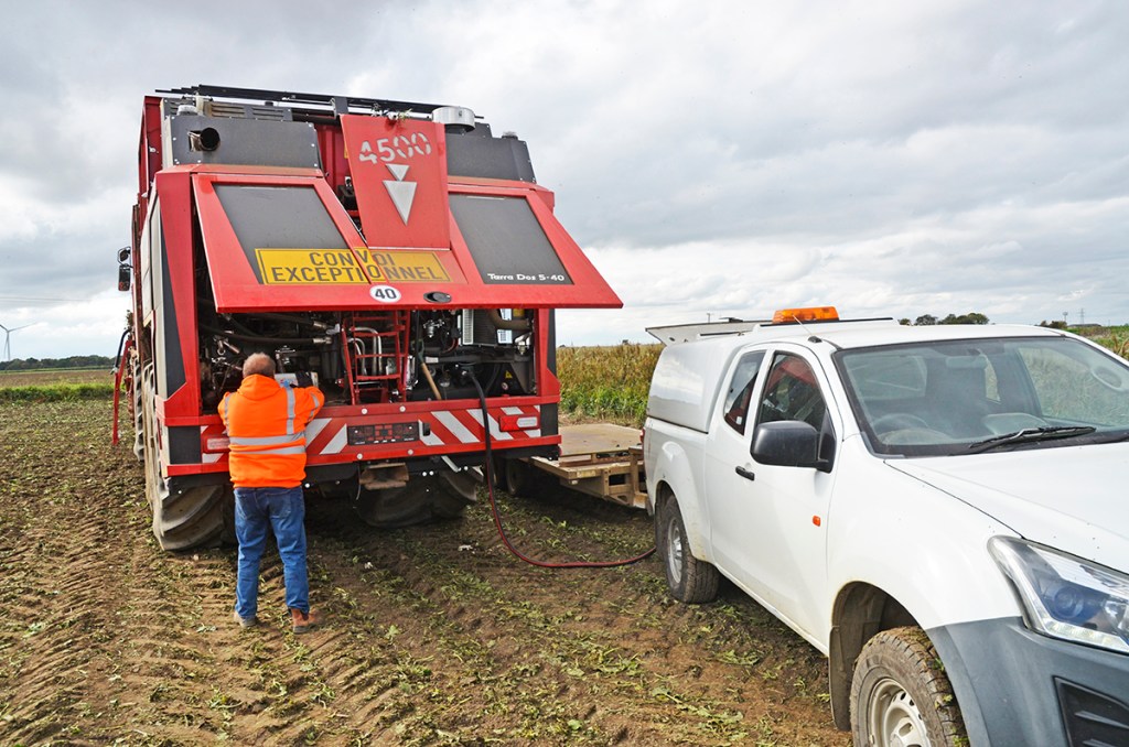 The contractor tows the pick-up behind the harvester when travelling between jobs. Top speed of the Terra Dos is 40km/hr.