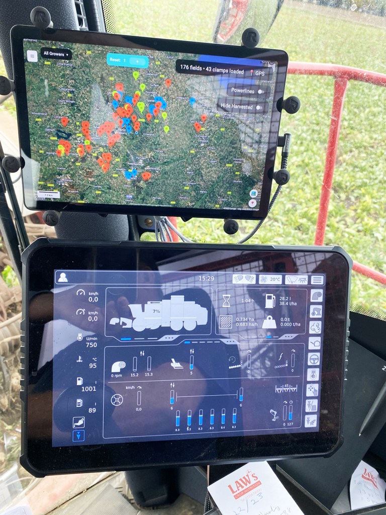 All harvester settings are displayed on the bottom screen. The top one shows which fields still to be lifted, which ones have already been harvested and clamped, and where beet has been delivered to the factory.