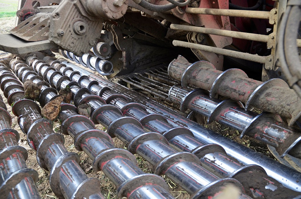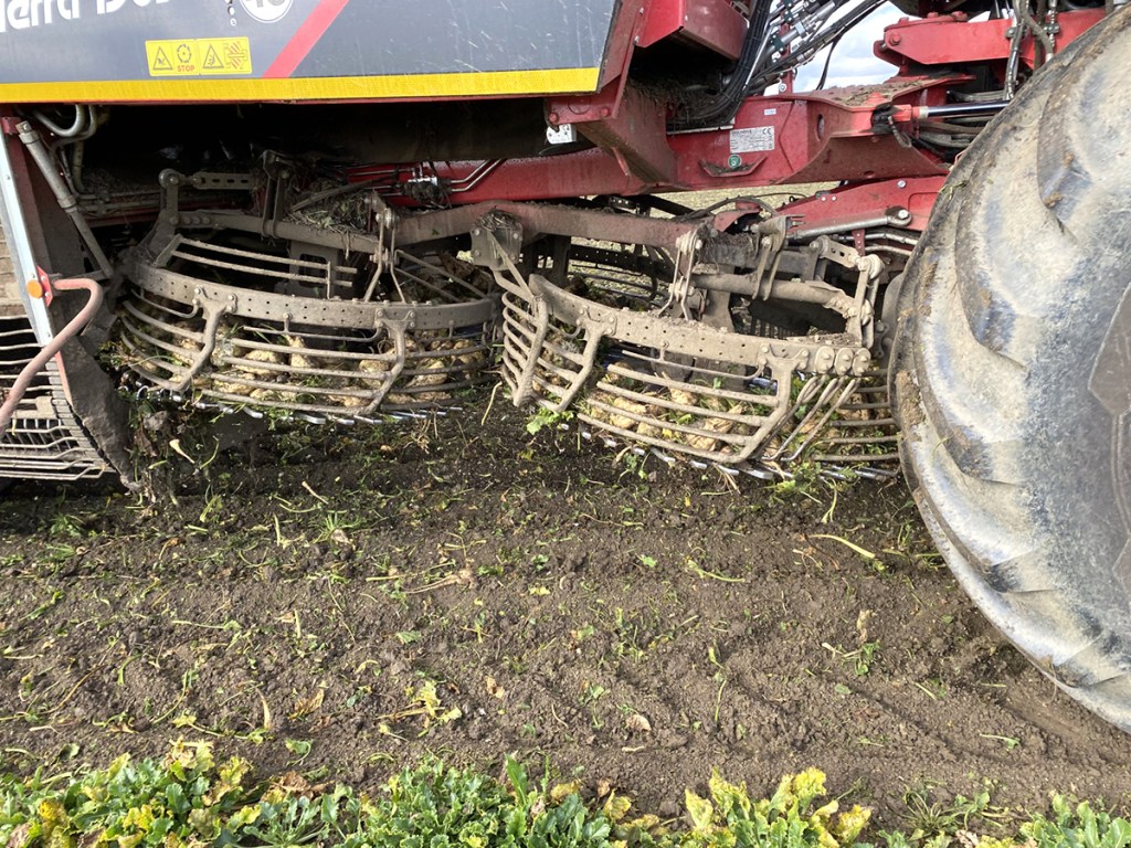 Something retained from the previous harvester is EasyLift. This patented technique automatically regulates individual depth of all six shares and flails on every row even when working on deeply rutted land. From here, roots pass across seven cleaning rollers. It was always possible to reverse the direction of the seventh, but the possibility to vary the speed to cope with higher volumes onto the transfer web between the front wheels to the first of the three turbines is new.