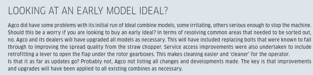 As to mechanical checks, the same used combine buying advice applies. Start at the header and work back. As most Ideal models will be sold through a dealer it is fair to expect the machine to have been prepared for retail sale, with late autumn and early winter a great time to look for a used buy.