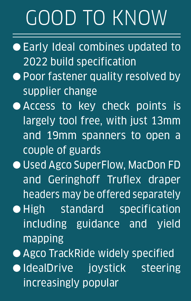 NOTE: New Ideal combines are offered with service and warranty packages of up to five years / 3,500 hours. A used buy may have the balance of its new warranty remaining but if this expires before you are going to work the machine ensure the combine has had a dealer check. This could ensure any necessary work covered by the warranty is completed ahead of it running out.