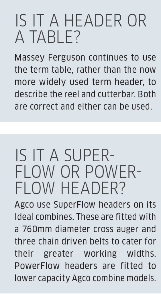 Massey Ferguson and Fendt Ideal models, like any combine, can be fitted with a variety of header designs. The standard offering will be a choice of 7.70m (25ft), 9.20m (30ft), 10.70m (35ft) or 12.20m (40ft) SuperFlow. These are fitted with three belts that run in the direction of travel to pass incoming crop to the cross auger. SuperFlow tables feature a 760mm diameter cross auger and a strengthened driveline when compared to the narrower PowerFlow headers offered on lower capacity Agco combines.