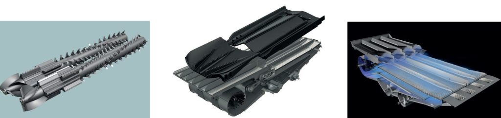 The IdealBalance grain pans (Agco give most elements of the combine a name) are made from plastic. They mount on rubber bushes to allow shaking like a conventional combine grain pan with no provision for adjustment or calibration with fewer component parts as a result. A deep ‘belly’ at the front of the pan has the capacity to accommodate a large quantity of crop and is claimed to allow slope compensation of up to 15%.