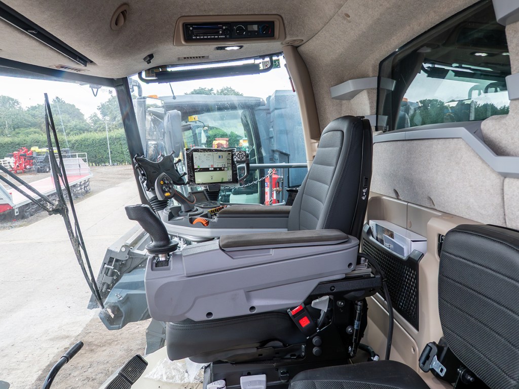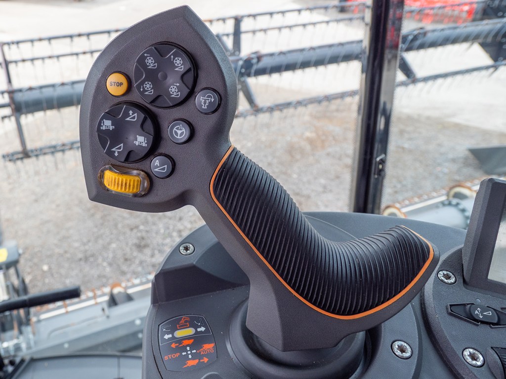 Up in the cab, you will find either a conventional steering wheel or IdealDrive joystick system (right). The latter is only offered on TrackRide models and is proving an increasingly popular choice. That being said, not all users like the system if tricky roads are part of their combine transport routes. Header visibility with or without a steering column is good.