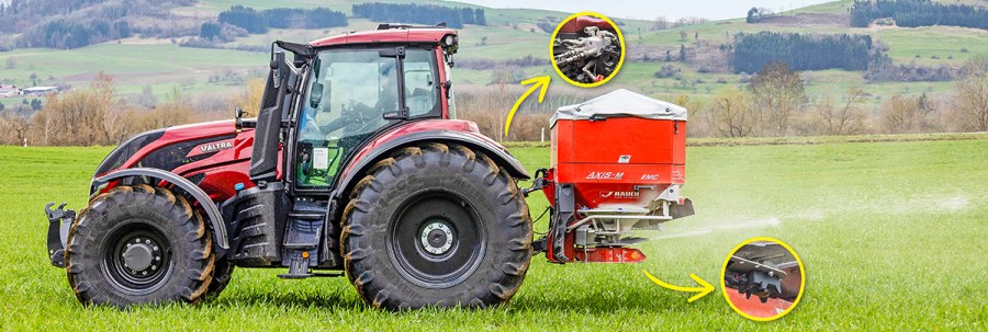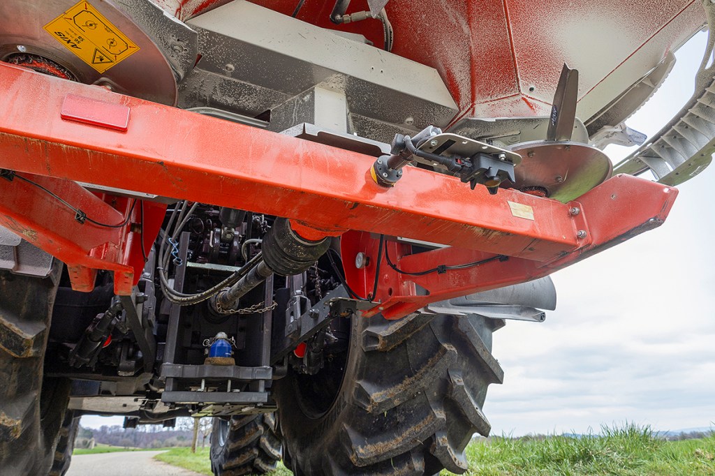As a fertiliser spreader empties, the weight distribution also changes. Which will make a difference to the angle of the discs and, in turn, the spreading pattern can suffer. Agco’s clever top link can self-adjust to keep the outfit on the level