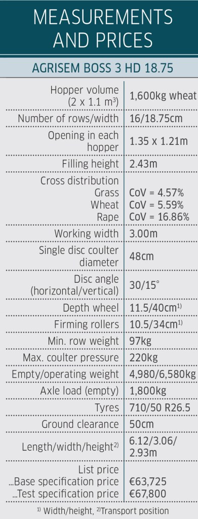 Agrisem’s Boss 3 HD 18.75 model is a classic direct seed drill with individual depth-controlled and angled single-disc coulters. Our test subject is the smallest of the trailed models that utilises the same Boss coulter system for machines up to 12m wide. The French firm also has a fully-mounted toolbar (3.0m to 9.0m) which can be used with a front hopper.