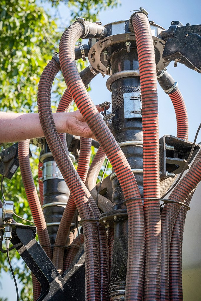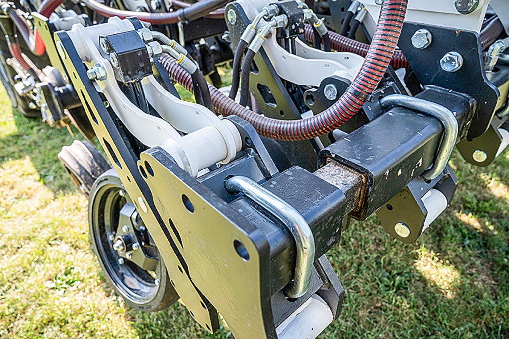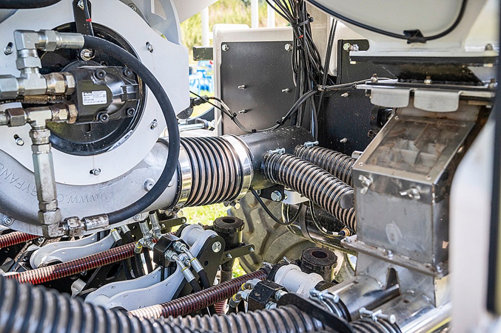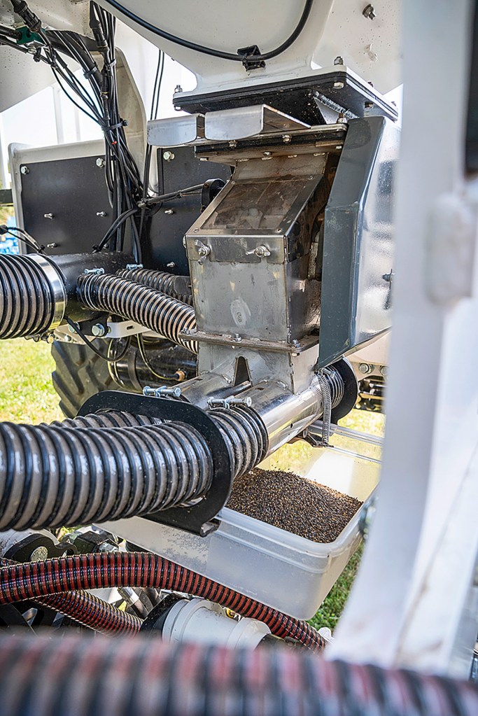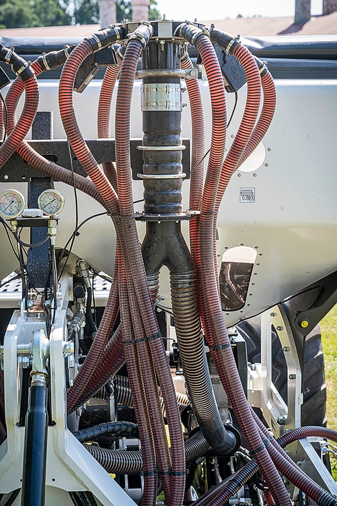 As mentioned, there are four delivery pipes in total. That’s two for each half of the split hopper, with one of these supplying the left distributor head, the other the right. Other configurations are possible for either single- or double-shot placement of different seed/material.