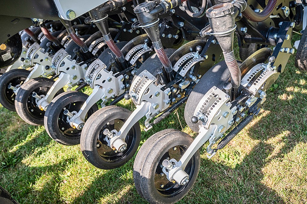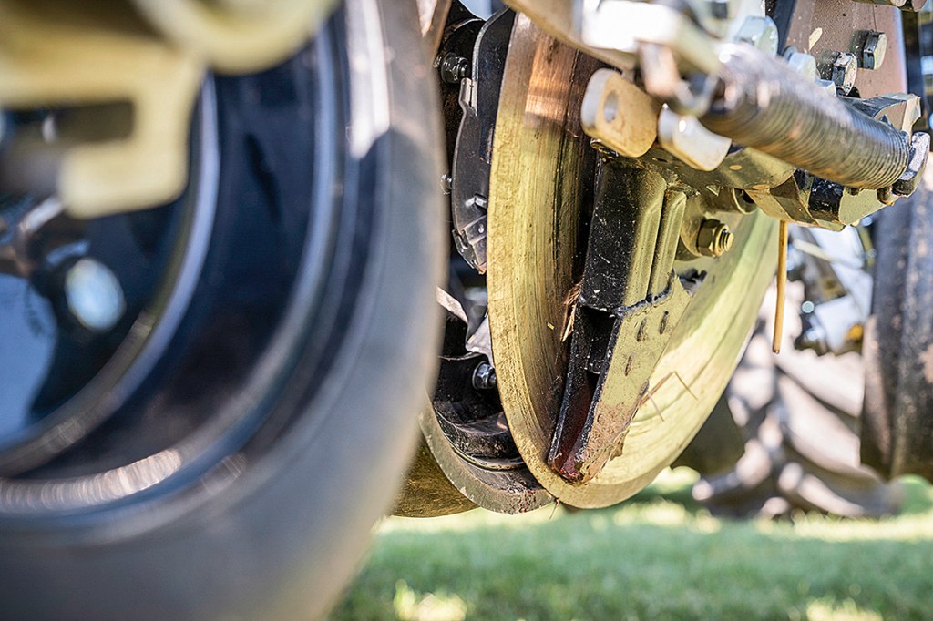 In the shadow of the disc is a tight-fitting seed boot, which places the seed in the soil. A press wheel then closes the furrow and precisely governs the depth of the seed boot. There are three types of press/closing wheel available; we had good results with the standard wheel on our medium to heavy soils.