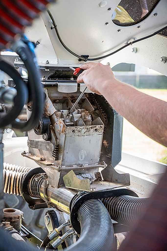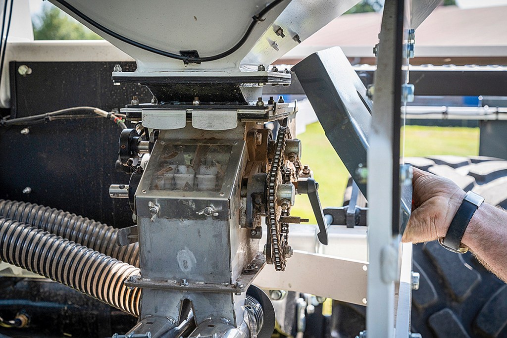 Nevertheless, the seed flow to each half of a metering wheel can be shut off with a slide. We would have preferred a more convenient way of adjusting the bottom flaps. Unfortunately, there is no mechanical means of emptying tank leftovers.