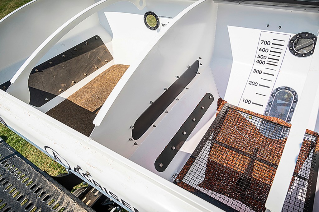 Our test machine had two hoppers, each rated at 1,100 litres capacity. We filled each with about 800kg of wheat, which is a bit tight. Agrisem also offers 1,600-litre double hoppers if you need more capacity. A sturdy tarp covers the opening, and the loading height of 2.43m is fine, too.