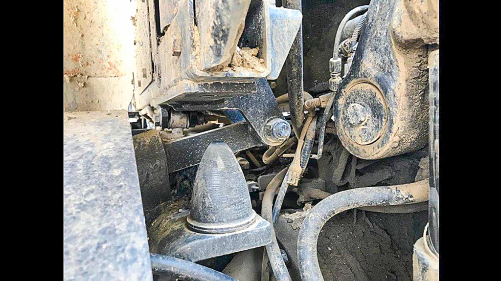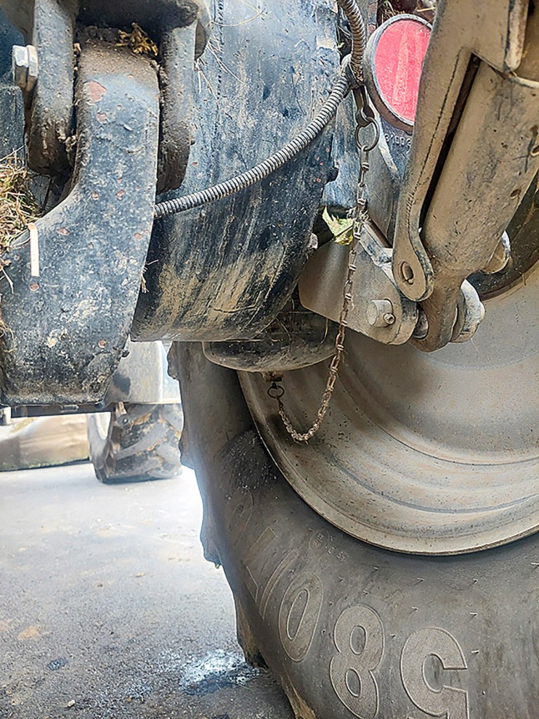 By adding a chain to the drain valve on the air tank of his Tier 1 CVX, Johan Vogel no longer has to crawl underneath or squeeze between the lift arm and wheel, making this routine maintenance chore a much cleaner and pleasanter task.
