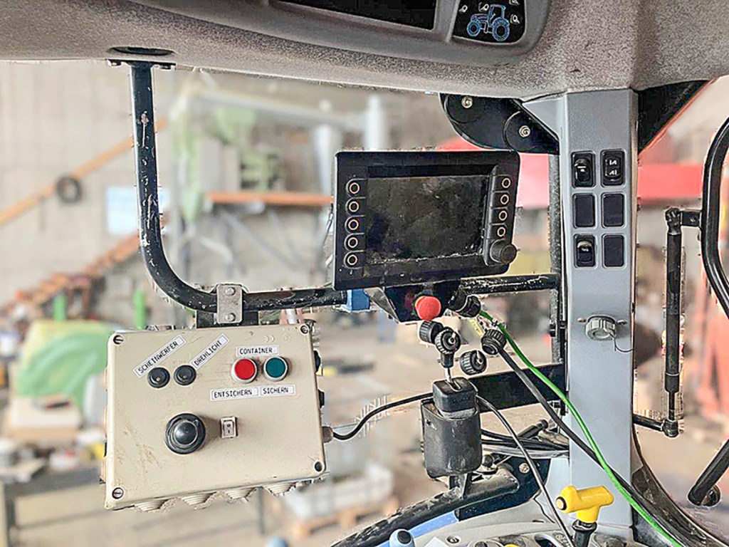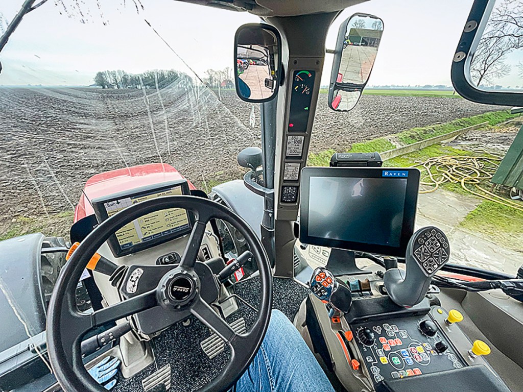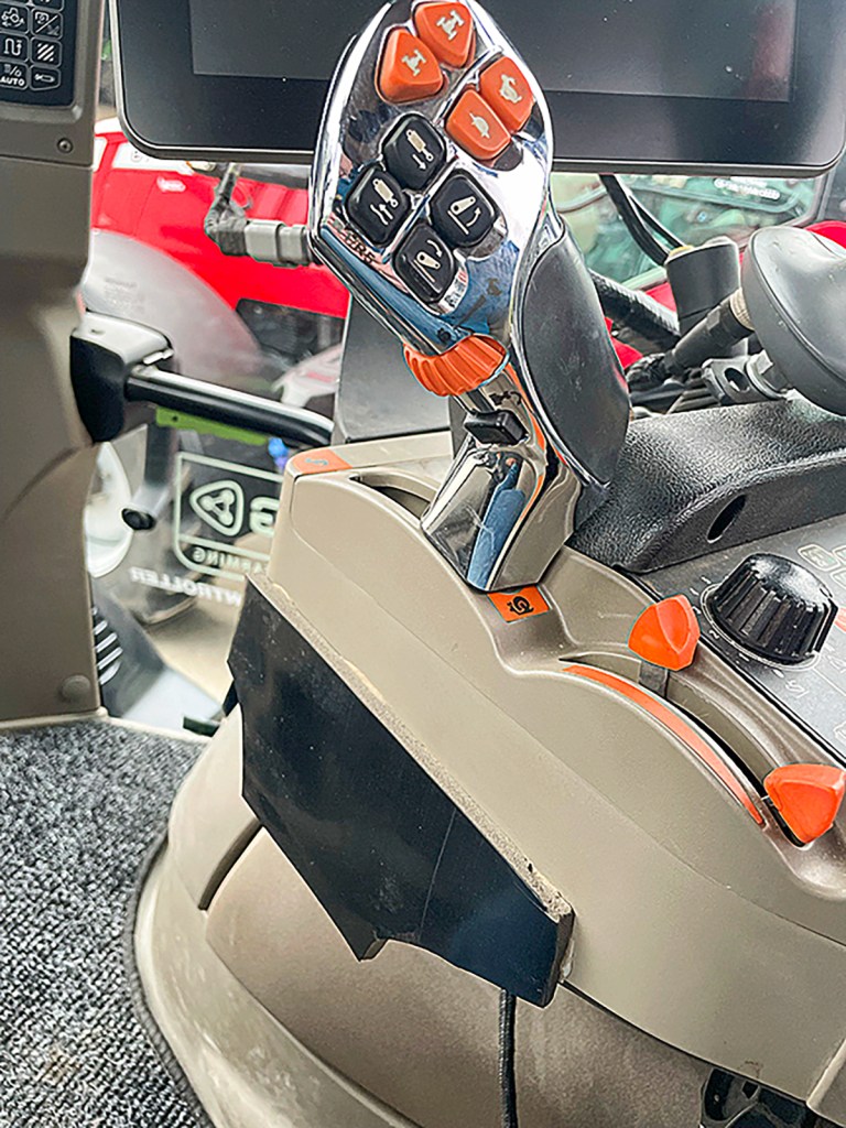 This cab has been given a bit of a rejig. The AFS 700 terminal, which was on the armrest, has been relocated to behind the steering wheel. This made it possible to fit the Raven display on the end of the armrest where it falls easier to hand for altering any ISObus and auto-steer settings. The Aux-N joystick has also found a home on the armrest.