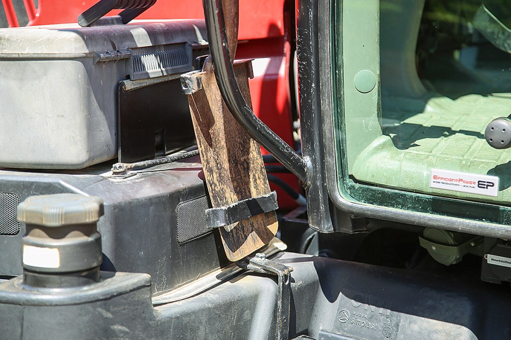 Josef Steininger also fitted a spade holder on the left-hand side between the toolbox and the handrail. Made from flat steel, the holder allows the user to remove the implement with one hand. And as the handle is hidden by the A-post, it doesn’t impair the driver’s view. He also fitted a number of tubes to store a selection of tools, including a hammer and a wrench.