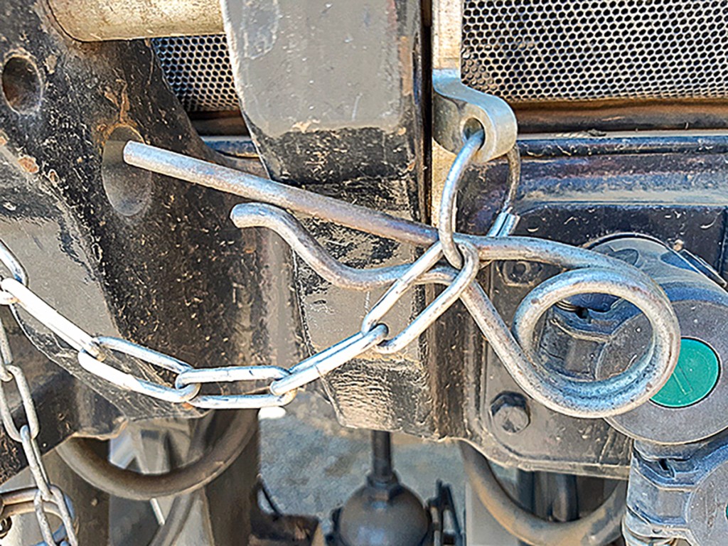 This modified R-clip is used to press open the Puma’s bonnet latch. One end of the clip was cut short to provide the relevant pushing rod. The R-clip is secured on a chain at the front of the tractor so it’s always nearby and ready to use.