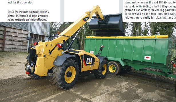 Run a finickety finger down the spec sheets of a Cat TH330B handler and its ‘08 replacement, the Cat TH407. Has anything actually changed? Not much, maybe – but look again. Rated lift capacity for the new machine climbs from 3,600kg to 3,700kg, with full lift stretching a modest 100mm to 7,300mm. Move on to the engine, and the ag spec TH407 is powered by the same 93.1kW/126hp Cat C4.4 power unit offered on its predecessor as the ‘high power’ option. At 499Nm, torque output is the same too, although within the TH407 it