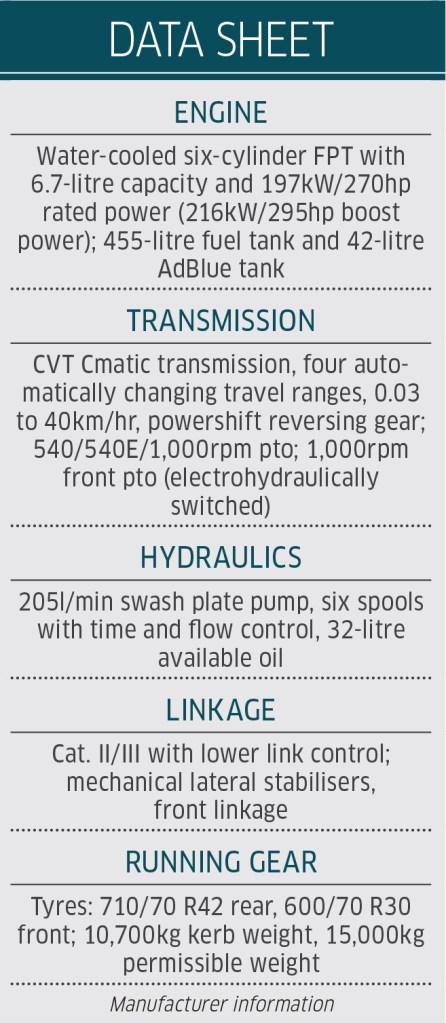 And speaking of lift capacity, for a 300hp tractor the weight distribution between the front and rear axles is good. Of the tractor’s 10.7t working weight, 58% rests on the rear axle and 42% on the front. User experience is the Axion doesn’t need a front weight to safely tow a trailed machine with a higher hitch weight, despite the K80 ball being pushed 12cm rearward on the drawbar.