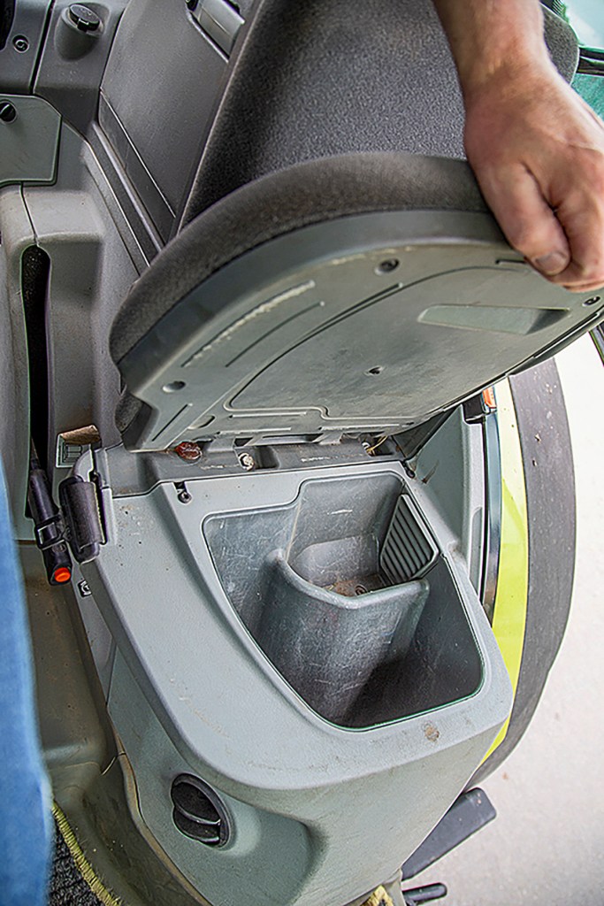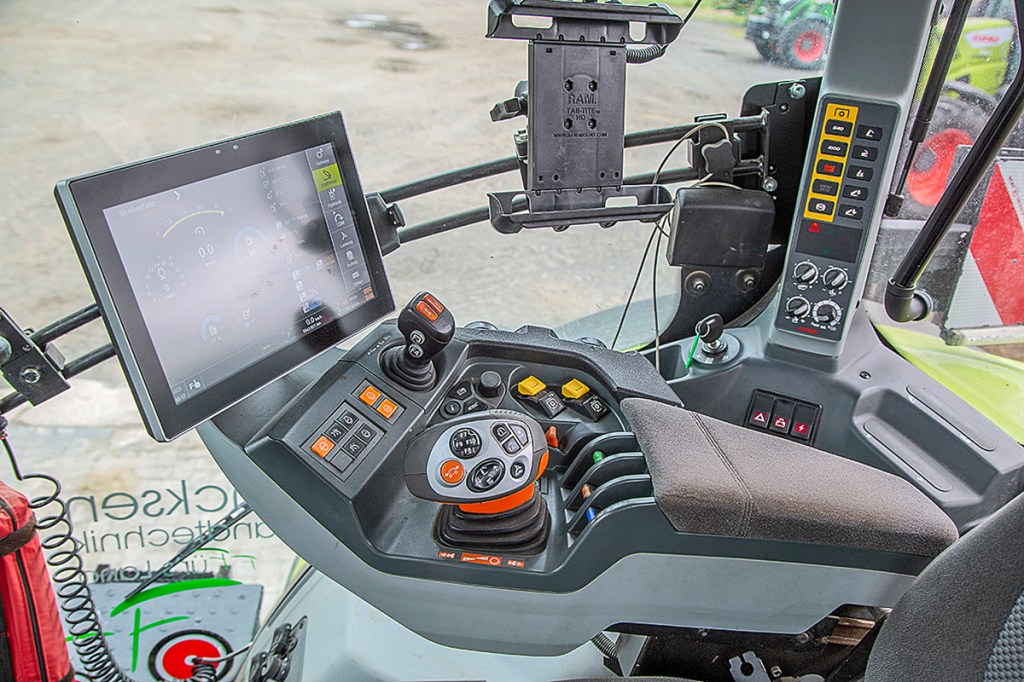 Our featured tractor has a Trimble auto steer set-up. This retrofitted system was the reason for rain leaking into the cab at 672 hours, a missing seal in the cab roof being the pinpointed culprit. The steering system is operated from an extra screen in the cab — the owner likes this solution, as it means the Cebis display on the armrest can be used for ISObus machines or remain free. But once you add the additional tablet (used for running software for contracting jobs) and CB radio, there is not much spare room on the right-hand side of the cab.
