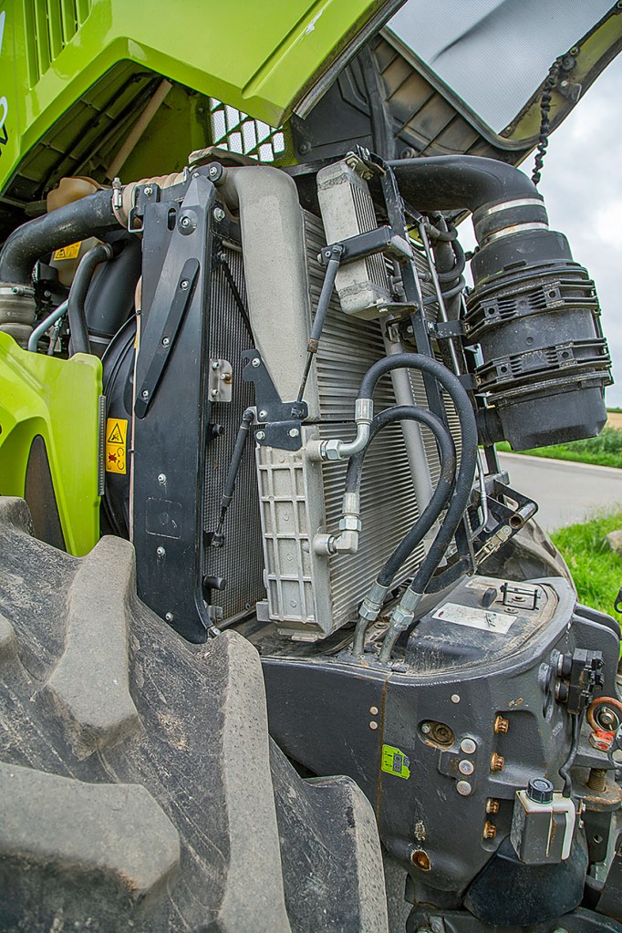 Moving on, the radiator pack performs well, even in dusty conditions, such as powering the front-mounted silage spreader when levelling and rolling the clamp. When the radiators do need cleaning, they open out from the bottom with a firm pull.