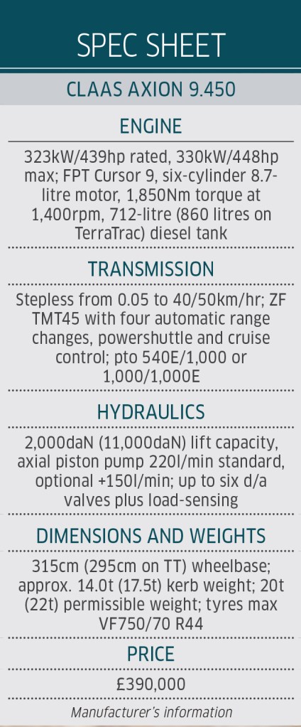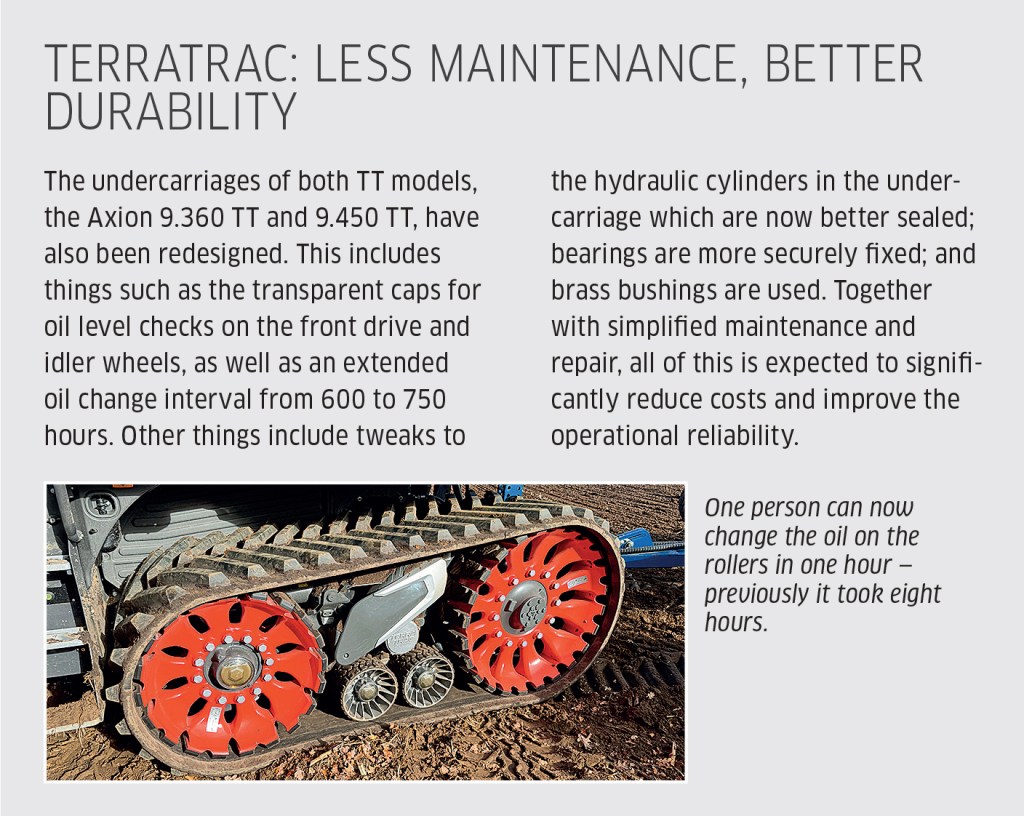 The range sticks with five wheeled models, starting with the Axion 9.330 that has a maximum output of 240kW/326hp and duly climaxes with the Axion 9.450, which maxes at 330kW/448hp. Both the 9.360 and 9.450 are also available as TT versions with the TerraTrac track system. The diesel tank capacity remains at a very generous 860 litres for both models.
