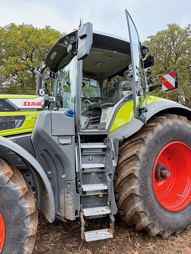 Claas has also increased the capacity of its wheeled machines: instead of 640 litres, the new 9s will carry 712 litres of diesel. They also get 11cm wider steps, making cab access that much better. Furthermore, not only is this cab area well illuminated, but lifting up the steps reveals a pull-out cantilever toolbox. There’s also a button at the side of the stairs to turn on the lights as well as battery power terminals and an air hose connector.