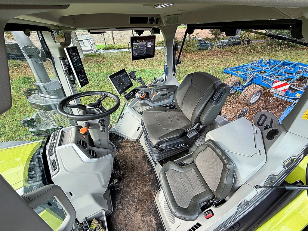 As for the driver’s seat, the electrically adjustable Ti seat from Isringhausen (this will be familiar to Fendt users) is available as a cost option — with every conceivable comfort feature. According to Claas, the driver’s seat can also be rotated 10° to the left for easy entry and exit and 40° to the right. Unfortunately, this amount of seat swivel is not available when it’s pushed all the way back.