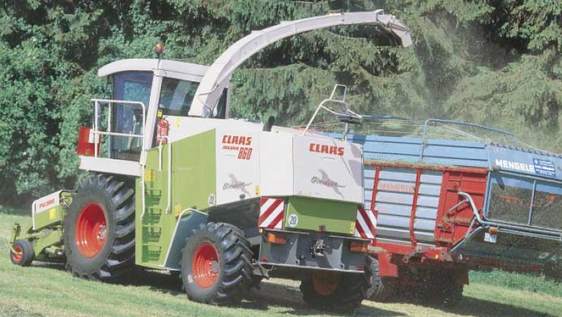 Current Claas 800 series foragers have a hydrostatic transmission that offers three gear ratios; 3rd transport, 2nd normal working and 1st for slow and heavy conditions. The operator can vary the operating speed using the hydrostatic lever in the cab, but to cope with soft or hilly conditions, it is necessary to stop and change down to the lowest ratio.