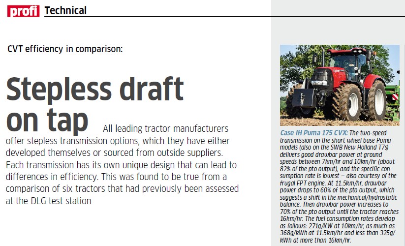 All leading tractor manufacturers offer stepless transmission options, which they have either developed themselves or sourced from outside suppliers. Each transmission has its own unique design that can lead to differences in efficiency. This was found to be true from a comparison of six tractors that had previously been assessed at the DLG test station