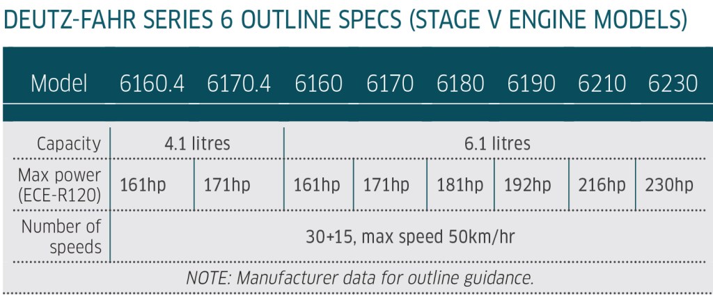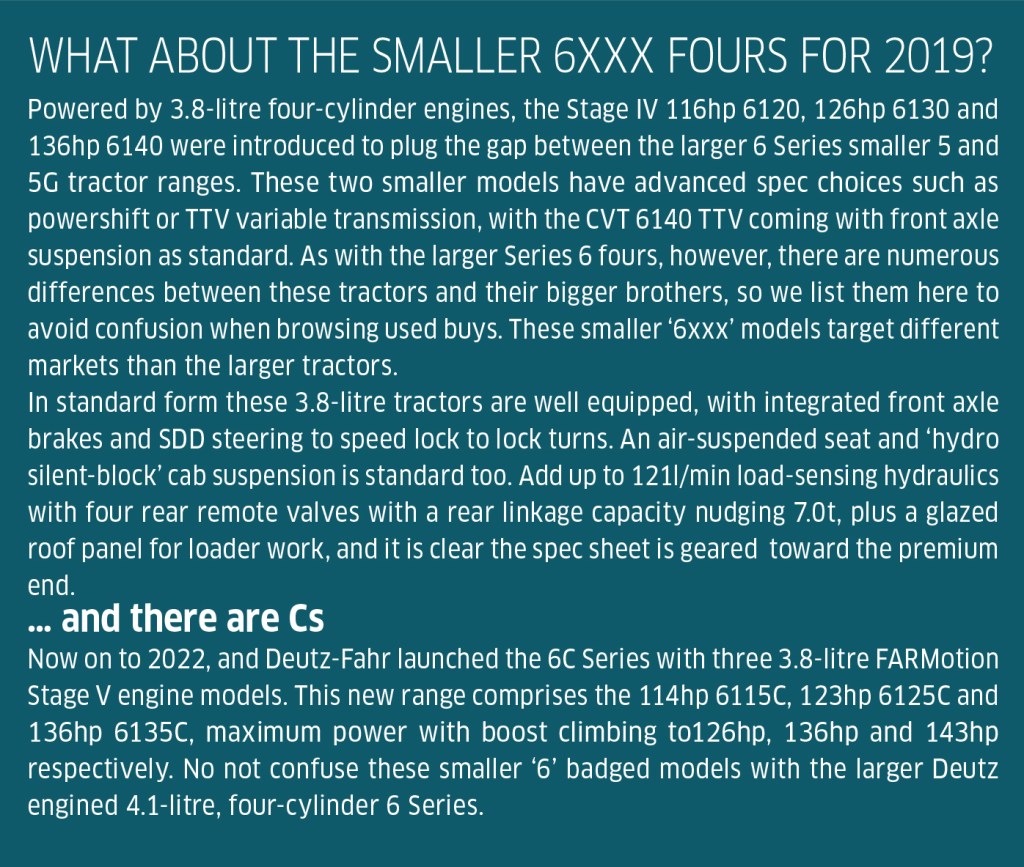 To complete the picture to a degree, there are also the four-cylinder models, enabling the Deutz-Fahr 6 Series and subsequent Stage V Series 6 to span rated power outputs of around 120hp to 230hp. In practice, the smaller four cylinder tractors are not strong sellers in the UK market, with the six-cylinder models the most likely used finds.