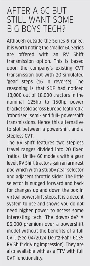 Now in its third generation, the Deutz-Fahr 6 Series tractor range divides into 4.1 litre four- and 6.1 litre six-cylinder models, with the latter the key sellers in the UK. Transmission choices include ‘conventional’ PS or electronically activated RC Shift powershift gearboxes and TTV stepless transmissions. That is the outline. Do you need to delve deeper when looking for a used buy?