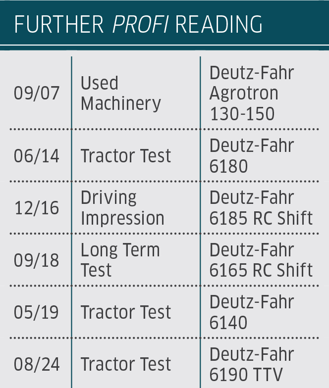 Are there any ‘watch out for this’ points with the TTV? If there are we have not had any brought to our attention. The consensus is these CVTs are hard to ‘abuse’ and, as long as service intervals of 1,000 hours have been strictly adhered to, should not be a concern even of a tractor showing 5,000hours plus. It is best to talk through any concerns you may have with a Deutz-Fahr dealer.