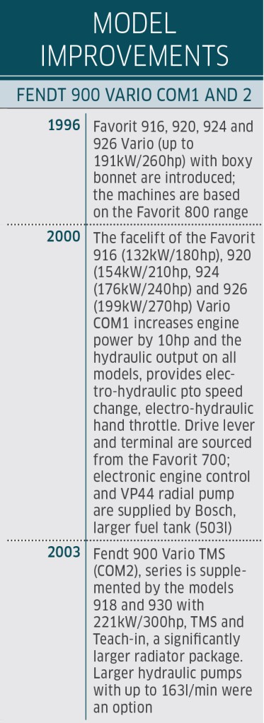The facelifted first-generation Fendt Favorit 900 Vario range (otherwise known as COM1) was only produced for about three years and is often overshadowed by its older Favorit siblings and also its replacement, the COM2 models with TMS.