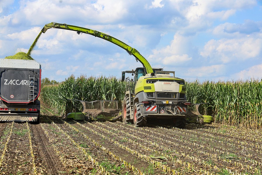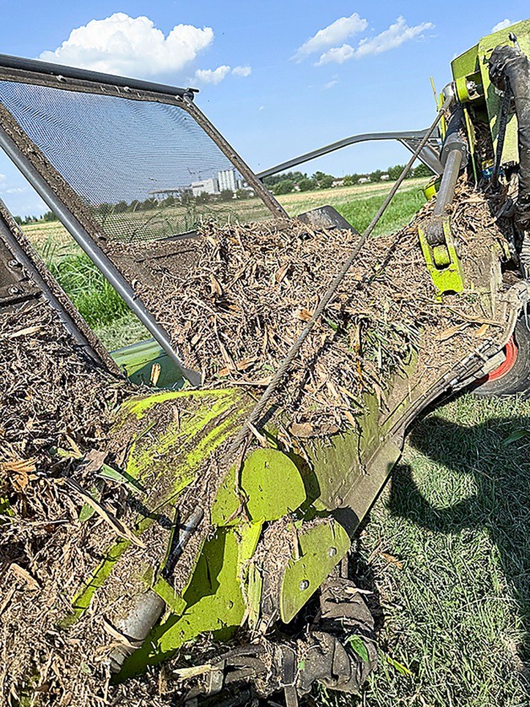 The north Italian maize was yielding 55-75t/ha with strong cobs, so, with the dry matter at 33%, we couldn’t have timed our visit any more perfectly. With the chop length set to 5mm, the Jaguar 1200 was able to trundle up and down the field at around 5km/hr, filling up the 50m³ push-off trailer with 21 tonnes of maize in 4 mins and 15 seconds. This equates to a throughput of 298 tonnes per hour if you don’t factor in any headland turning time.