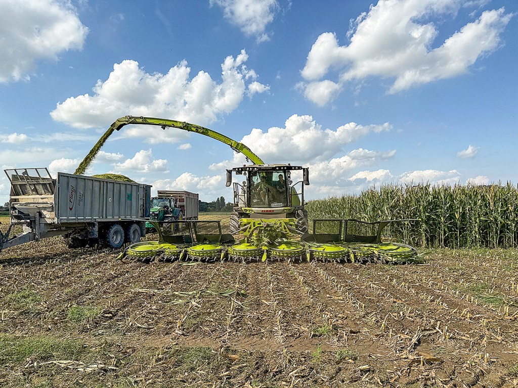The monster forager made life at the clamp rather hectic — three large tractors were busy distributing and compacting the crop being delivered by a fleet of a dozen trailers.