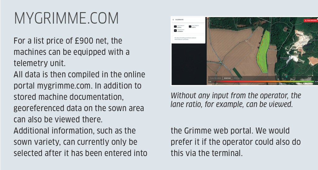 The optical sensors work very reliably and, according to Grimme, even detect rapeseed. We made little use of the sacrificial row function with increased seeding rates at field boundaries — as well as the adjustable planting windows, which we only consider useful for 45cm rows.