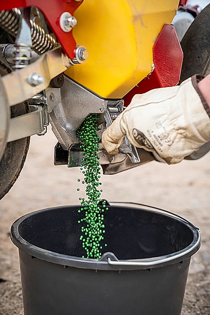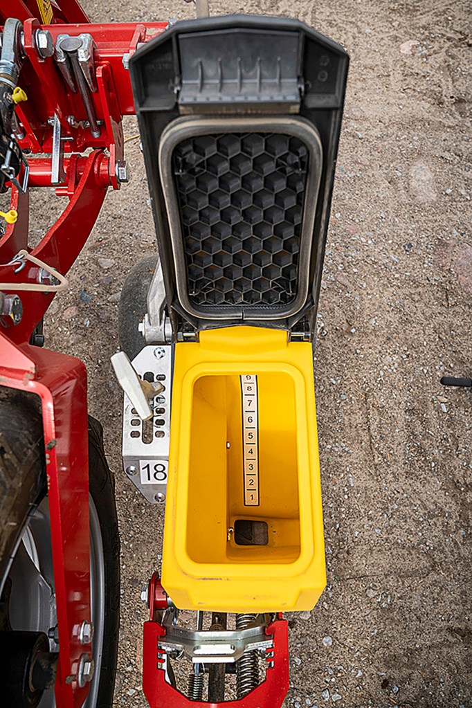 The machine also scores points for its ease of adjustment: sowing depth adjustment, cover discs, and intermediate press wheels are all easily accessible. A useful addition would be a limiter for the forward movement of the cover disc handle. The seed hoppers hold 1.5 units or 10 litres of seed — just right. The hopper opening is sufficiently large, and the internal scale is a neat detail.