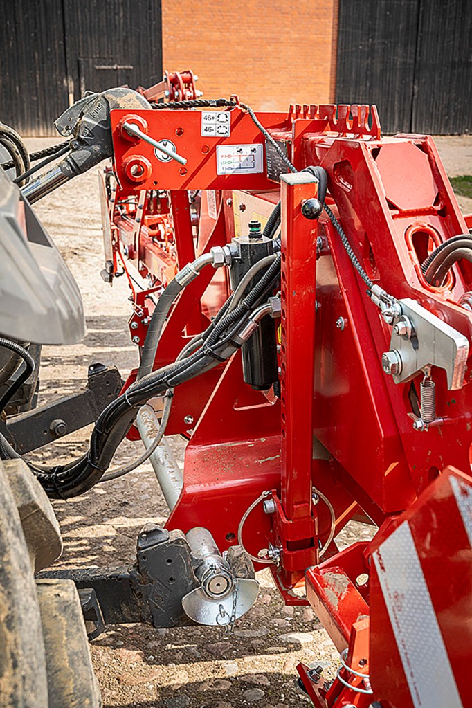 Coupling up is quick and easy: three pipes for the load-sensing hydraulics, a double-acting spool for the bout markers; then just plug in the lights and ISObus. Final part of the coupling puzzle is the rope that opens the emptying flaps, along with a control box with emergency stop and field/road mode selector that also goes into the cab.